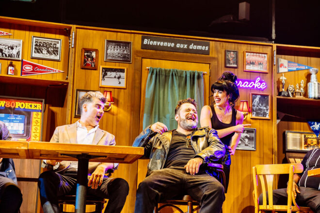 Le jeu des comédiens est bon et la ressemblance physique de certains membres à la distribution originale est intéressante. Personnellement, j’aurais vu David Savard en Boisvert plutôt qu’en Bob. Comme nous sommes dans le thème du hockey, je m’en voudrais de rater l’occasion de nommer les trois étoiles de la partie. La troisième étoile : Marilou Morin. Ayant moins de personnages que dans le film, un plus grand espace est accordé à Sonia. Tout en gardant le jeu de la séduction du film, Marilou interprète une Sonia à la fois féminine et forte. Les répliques aux commentaires des Boys sont cinglantes et savoureuses. Le personnage est développé sur un autre niveau et elle le rend bien. La deuxième étoile : Louis Champagne. Il a joué le rôle de Doggie dans le film et interprète maintenant Méo, son ancien patron. Les fans reconnaitront des gestes et intonations de Pierre Lebeau, le Méo du film. Nous ne ressentons pas une copie conforme du personnage original, mais plutôt que Louis se l’approprie et l’enrichit par le sentiment d’être en terrain connu. Et la première étoile, the first star : Marie-Pier Labrecque. Elle joue tous les autres rôles féminins, de madame « saucisse à cocktail » à Lisette en passant par Karine. Ce qui la propulse en première en tête c’est son interprétation magistrale de Marcel. Chaque ligne, chaque présence font rire la foule. Elle vole carrément la vedette.