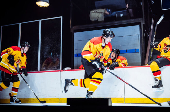 Le décor joue un grand rôle dans le succès de la pièce. Particulièrement la brasserie et l’aréna. Nous pouvons même voir les comédiens patiner sur la scène! Je ne peux passer sous silence le travail de Guillaume Corbeil qui a fait l’adaptation pour la scène. Il a su redistribuer certaines citations de personnages absents à d’autres, tout en gardant une logique parallèle au film.