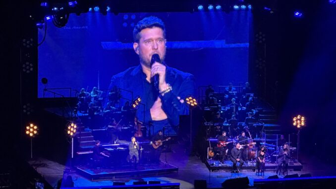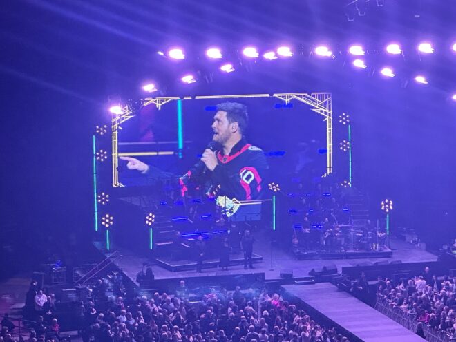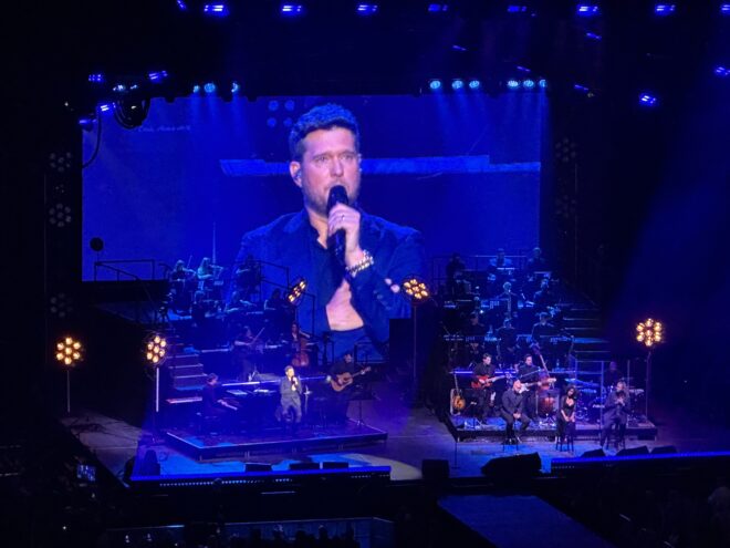 Accompagné de vingt-deux musiciens sur scène et de trois choristes, le crooner n’a pas déçu les spectateurs fébriles. Jumelant musique et humour, Michael Bublé a su séduire une foule conquise d’avance. Il a couvert ses plus grands succès, que ce soient les reprises ou ses pièces originales. Il nous a également offert un succulent medley de chansons d’Elvis Presley. Il variait les styles musicaux de la pop à la symphonie cinématographique.